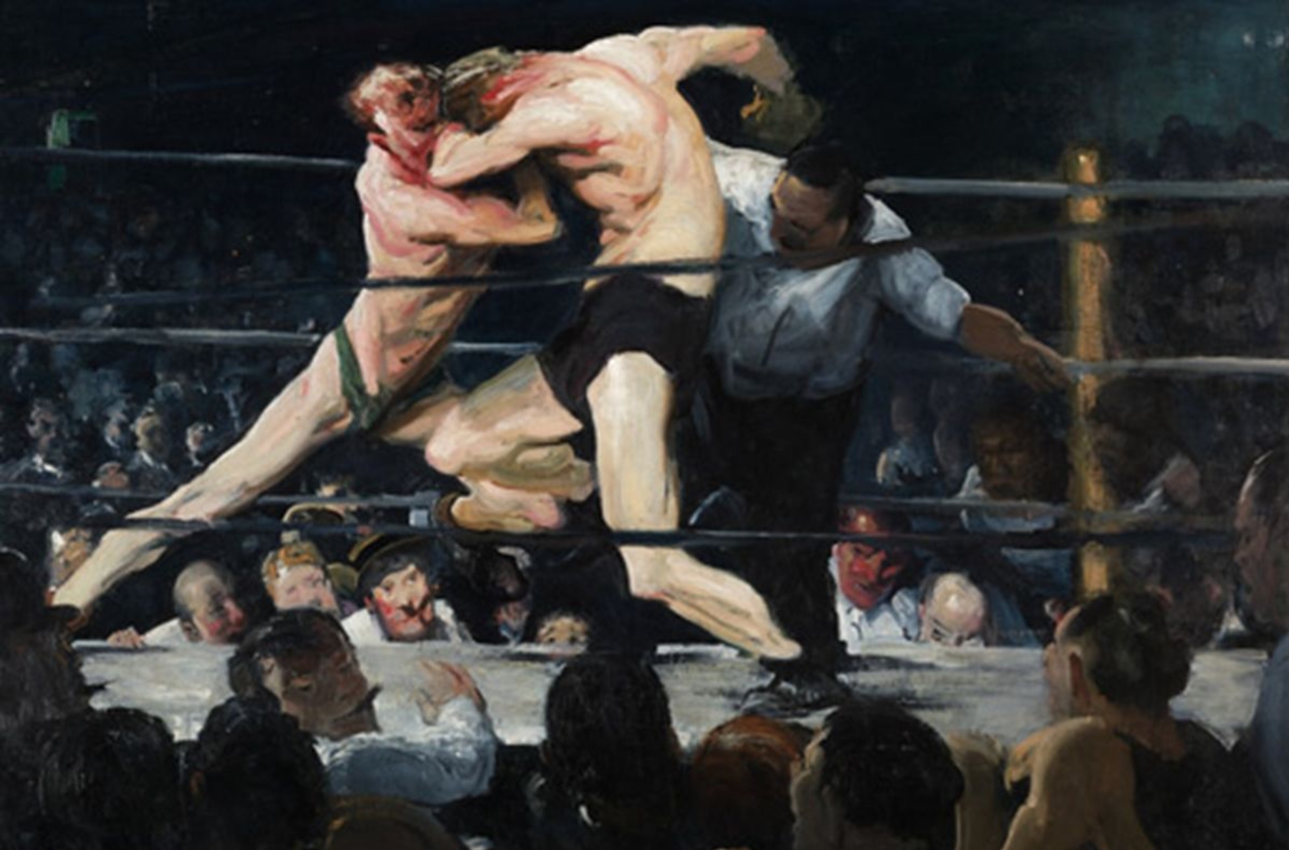“අමෙරිකානු චිත්ර කලාවෙහි පුරෝගාමියෙකු වූ බෙලෝස් මේ චිත්රයෙහි නිරූපණය කරන්නේ සකල සියලු කායික මානසික සීමා ඉක්මවා ගිය සටනකි. ප්රචන්ඩ පින්සල් පහරින් නිර්මිත වූ ශරීරයෝ එකිනෙකා මත කඩා වදිත්. විනිශ්චයකරුවා ද, ප්රේක්ශකයෝ ද සටනේ ම කොටස්කරුවෝ වෙති. ප්රේක්ෂක සමූහය අන්ධකාර පාතාලයට හෙලා ඇත. මහත්වරුන්ගේ කට රැඳි සුරුට්ටු, සංහාරකාමිත්වය විනෝදයක් වී ඇති බව කියාපායි.” (සටහන: එරික් ඉලයප්ආරච්චි, චිත්ර කලාව හා විචාරය)