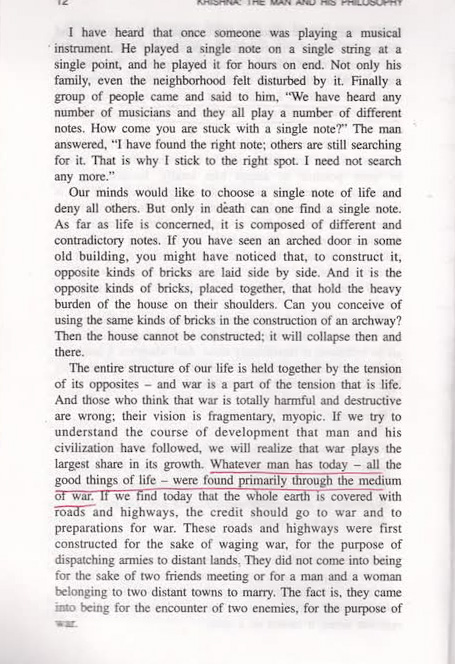 “බොහෝ අය සිතන්නේ මහාභාරත යුද්ධය වළක්වාලූයේ නම් ඉන්දියාව දැවැන්ත බලපෑමක් අත් කර ගන්නට තිබූ බවය. වර්ධනයේ සහ ශ්රේෂ්ඨත්වයේ ඉහළම මුදුන් ස්පර්ශ කර ගන්නට තිබූ බවය. එහෙත් සත්යය වන්නේ ඉඳුරා ම එහි විරුද්ධ පැත්තය. ක්රිෂ්ණාගේ දක්ෂතාවෙන් යුතු තවත් අතලොස්සක් දෙනා අප සතු විණි නම් සහ මහාභාරතය වැනි තවත් යුද්ධ අප කර තිබුණේ නම්, අද අප වර්ධනයේ මුදුනතම සිටින්නට තිබිණි.