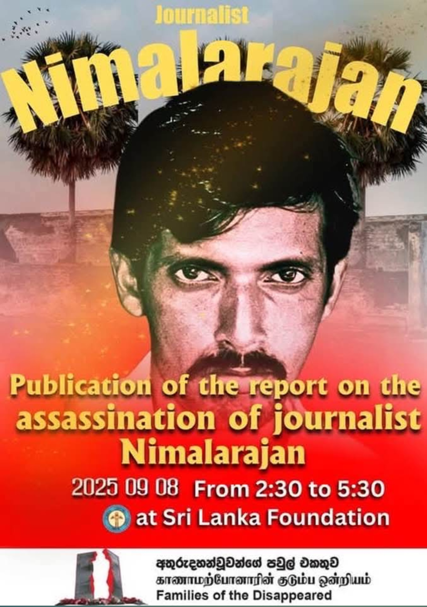 මාධ්යවේදී නිමලරාජන් ඝාතනයේ වාර්තාව එළිදැක්වීම 2025 සැප්තැම්බර් 08 වන දින පස්වරු 2.30 සිට 5.30 දක්වා ශ්රී ලංකා පදනම් ආයතනයේදී පැවැත්වේ.